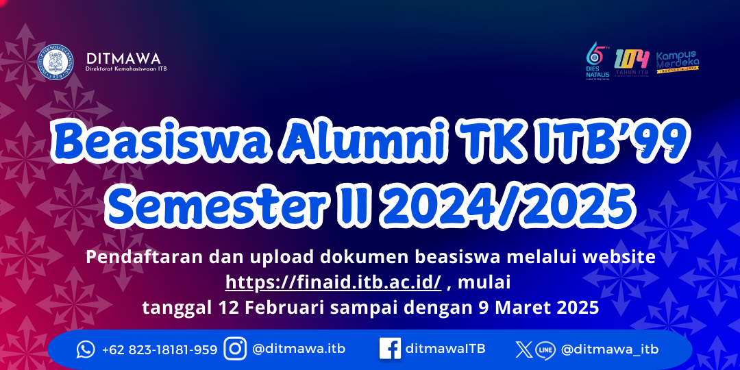 Pendaftaran dan upload dokumen beasiswa melalui website https://finaid.itb.ac.id/ , mulai tanggal 12 Februari s.d 9 Maret 2025