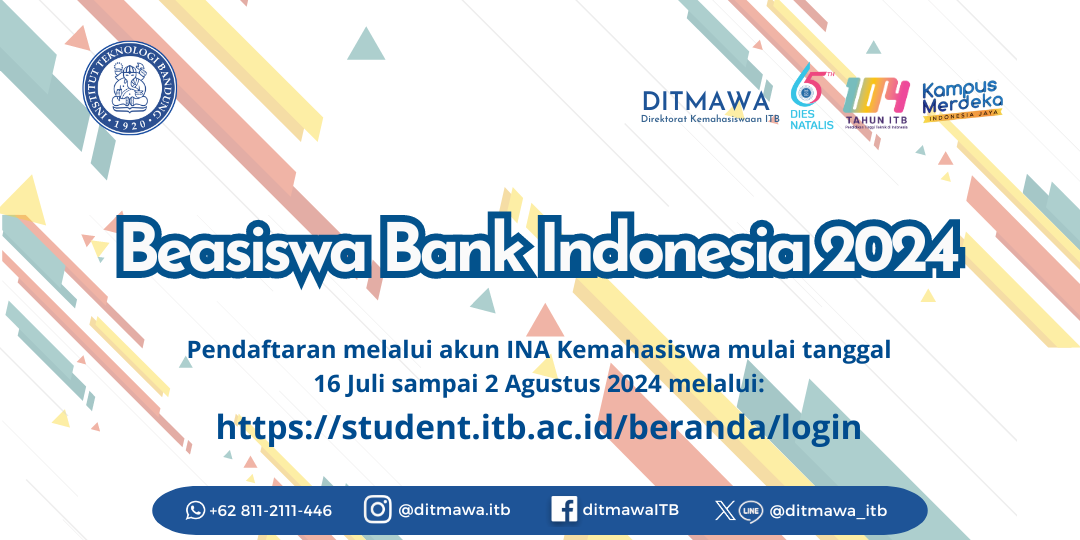 Bank Indonesia membuka kesempatan beasiswa untuk mahasiswa/i program Sarjana (S1) ITB angkatn 2021 dan 2022, dengan beasiswa unggulan sebesar Rp. 1.500.000/bulan dan besiswa reguler sebesar Rp. 1.000.000/bulan.