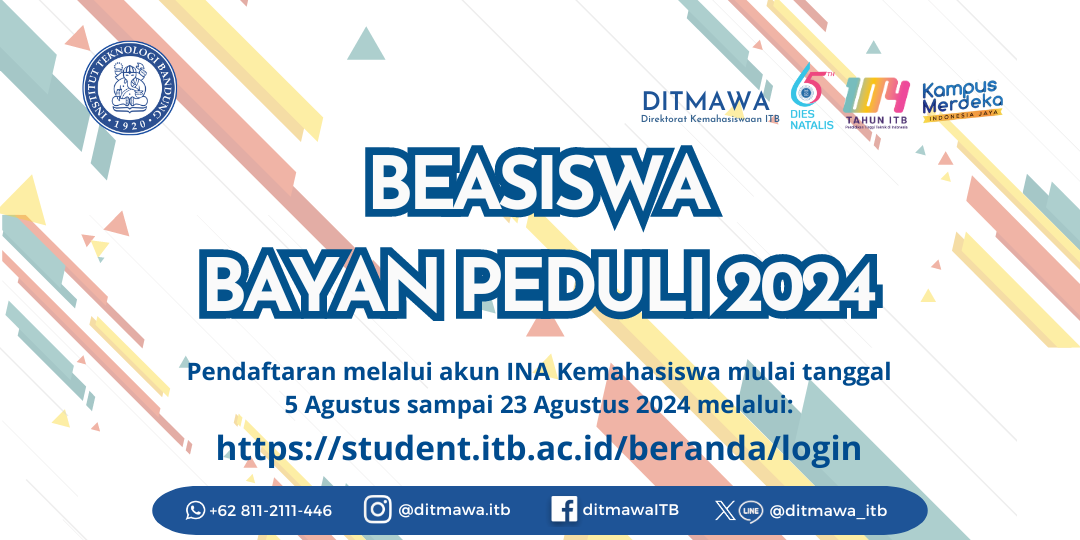 - Surat sedang tidak menerima beasiswa lain (pengajuan melalui akun INA Kemahasiswan ITB paling lambat tgl 22 Agustus 2024 jam 13.00 WIB)