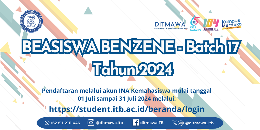 Ikatan Alumni Kimia ITB 2011 dan 2012 membuka kembali Beasiswa BENZENE periode Batch 17 Tahun 2024, bagi mahasiswa/i ITB program studi S1 Kimia ITB dengan benefit berupa bantuan biaya hidup dan/atau bantuan biaya UKT.