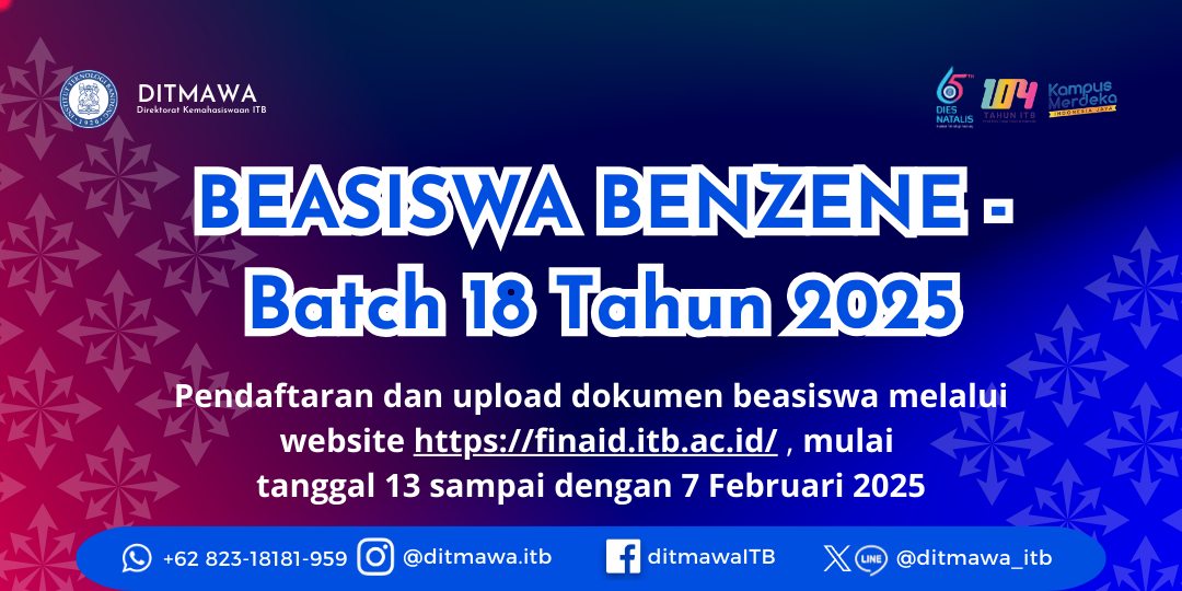 Ikatan Alumni Kimia ITB 2011 dan 2012 membuka kembali Beasiswa BENZENE periode Batch 18 Tahun 2025, bagi mahasiswa/i ITB program studi S1 Kimia ITB dengan benefit berupa bantuan biaya hidup dan/atau bantuan biaya UKT.