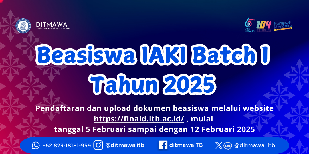 Pendaftaran dan upload dokumen beasiswa melalui website https://finaid.itb.ac.id/ , mulai tanggal 5 Februari sampai dengan 12 Februari 2025.