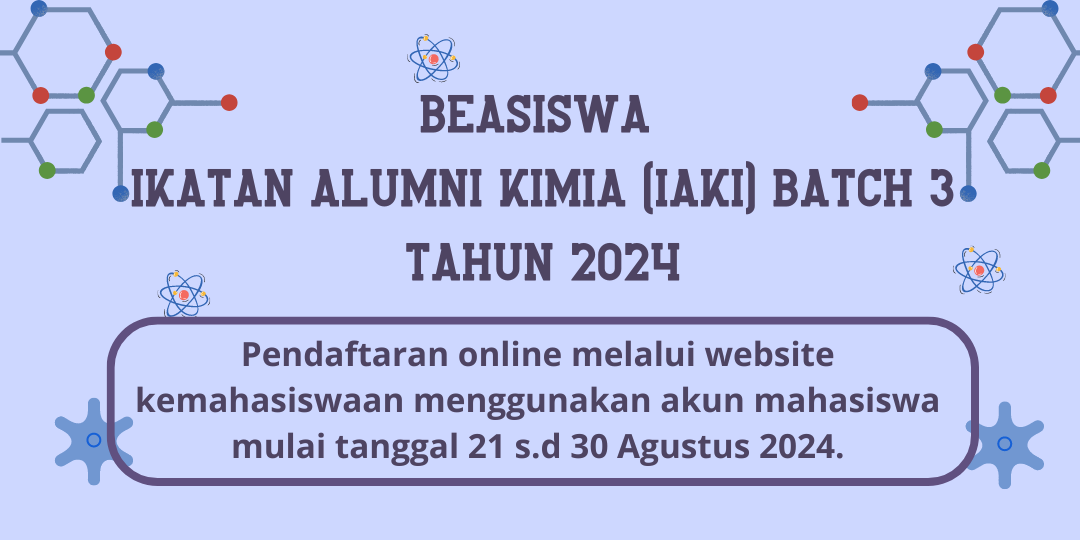 Beasiswa Ikatan Alumni Kimia (IAKI) ITB membuka kembali beasiswa untuk mahasiswa/i S1 program studi Kimia berupa bantuan biaya hidup sebesar Rp. 4.200.000 persemester.