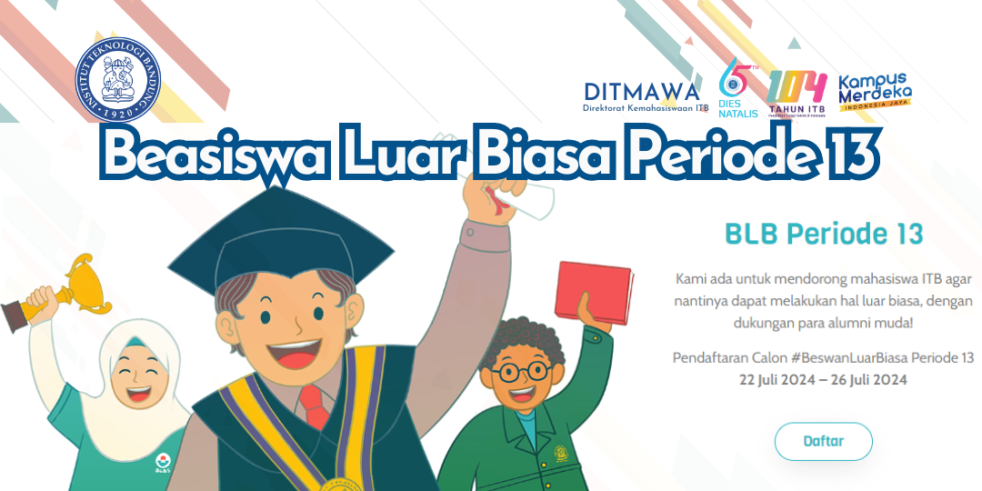 Pendaftaran Beasiswa Luar Biasa (BLB) Periode 13 untuk mahasiswa S1 ITB sudah dibuka hingga tanggal 26 Juli 2024