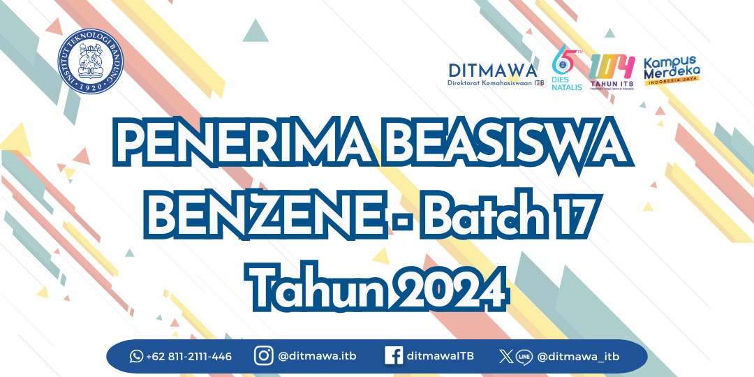 Beasiswa BENZENE Batch 17 Tahun 2024 merupakan program Ikatan Alumni Kimia ITB Angkatan 2011 dan 2012 yang memberikan beasiswa berupa bantuan biaya hidup kepada mahasiswa program studi Kimia.