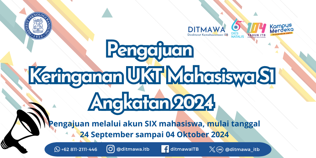 Institut Teknologi Bandung membuka pengajuan keringanan UKT untuk mahasiswa S1 ITB Angkatan 2024 mulai tanggal 24 September 2024 sampai 04 Oktober 2024.