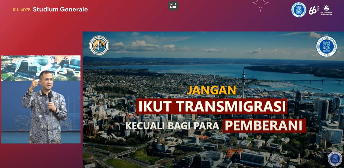 BANDUNG, kemahasiswaan.itb.ac.id - Kuliah umum Studium Generale ITB kembali digelar pada Rabu (28/5/2025) di Aula Barat Kampus ITB Ganesha. Kuliah ini diikuti oleh mahasiswa ITB Multikampus baik dari Ganesha, Jatinangor, dan Cirebon. Kuliah juga ditayangkan melalui platform YouTube Institut Teknologi Bandung sehingga bisa ditonton masyarakat umum. Kuliah ini mengundang Menteri Transmigrasi Republik Indonesia, M. Iftitah Sulaiman Suryanegara dengan membawakan materi bertajuk “Transmigrasi Maju, Indonesia Maju”.